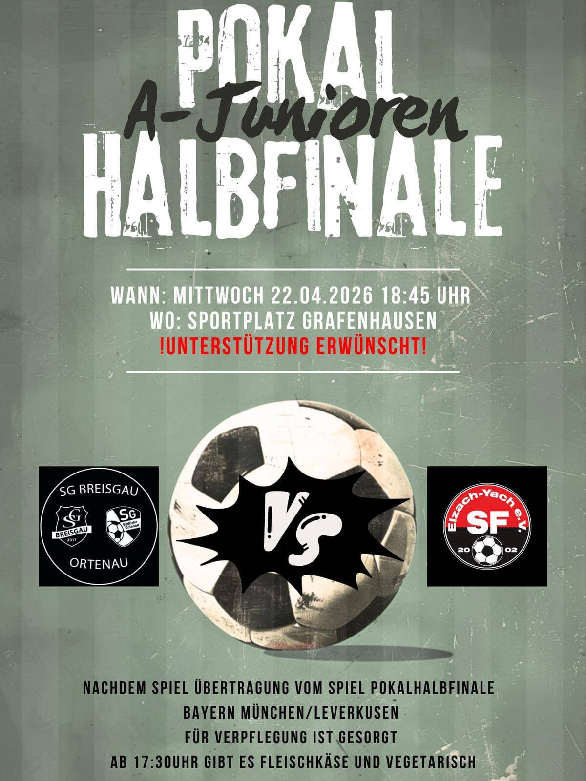 Am Mittwoch, 22.04.2026 um 18:45 Uhr steigt auf dem Sportplatz Grafenhausen das Pokal‑Halbfinale der A‑Junioren: SG Breisgau/Ortenau vs. SG Oberes Elztal.